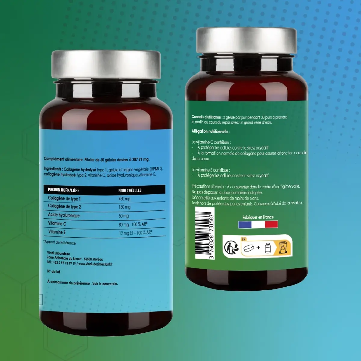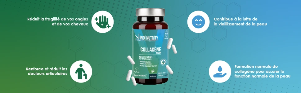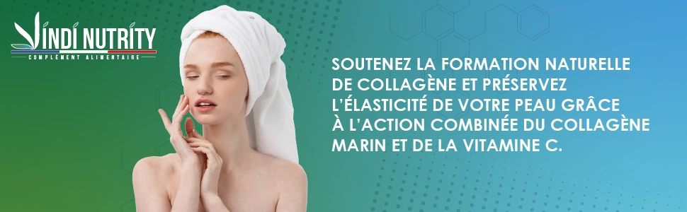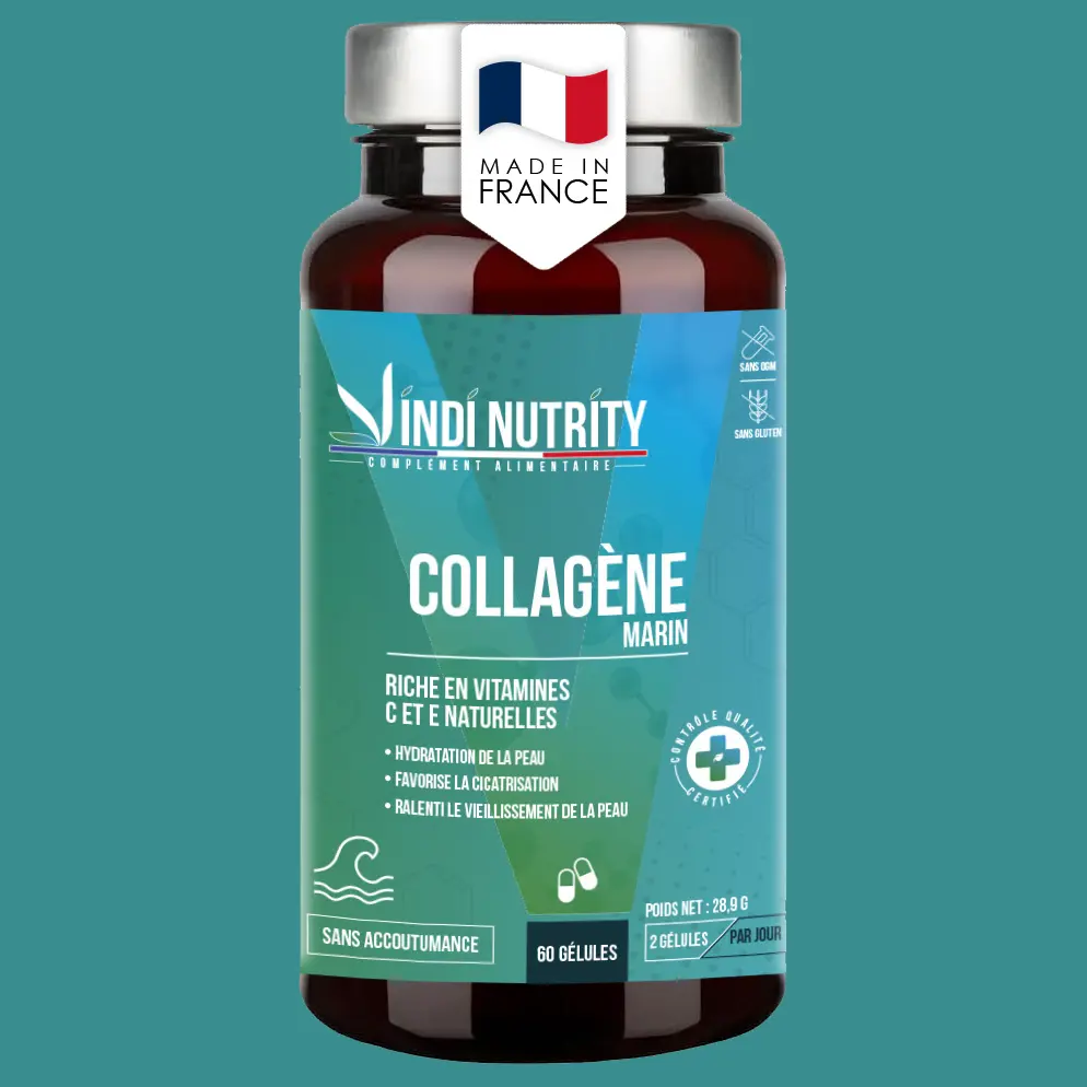 Vindi Nutrity Collagène Marin est une formule avancée enrichie en vitamines C et E, en acide hyaluronique et en collagène hydrolysé type 1 et 2 pour soutenir la régénération cellulaire et ralentir le vieillissement cutané.