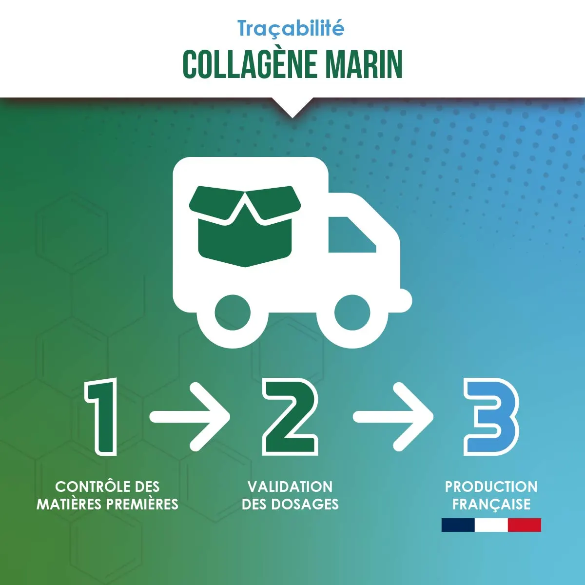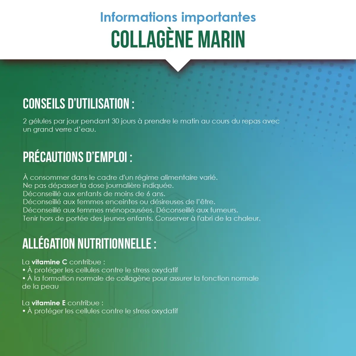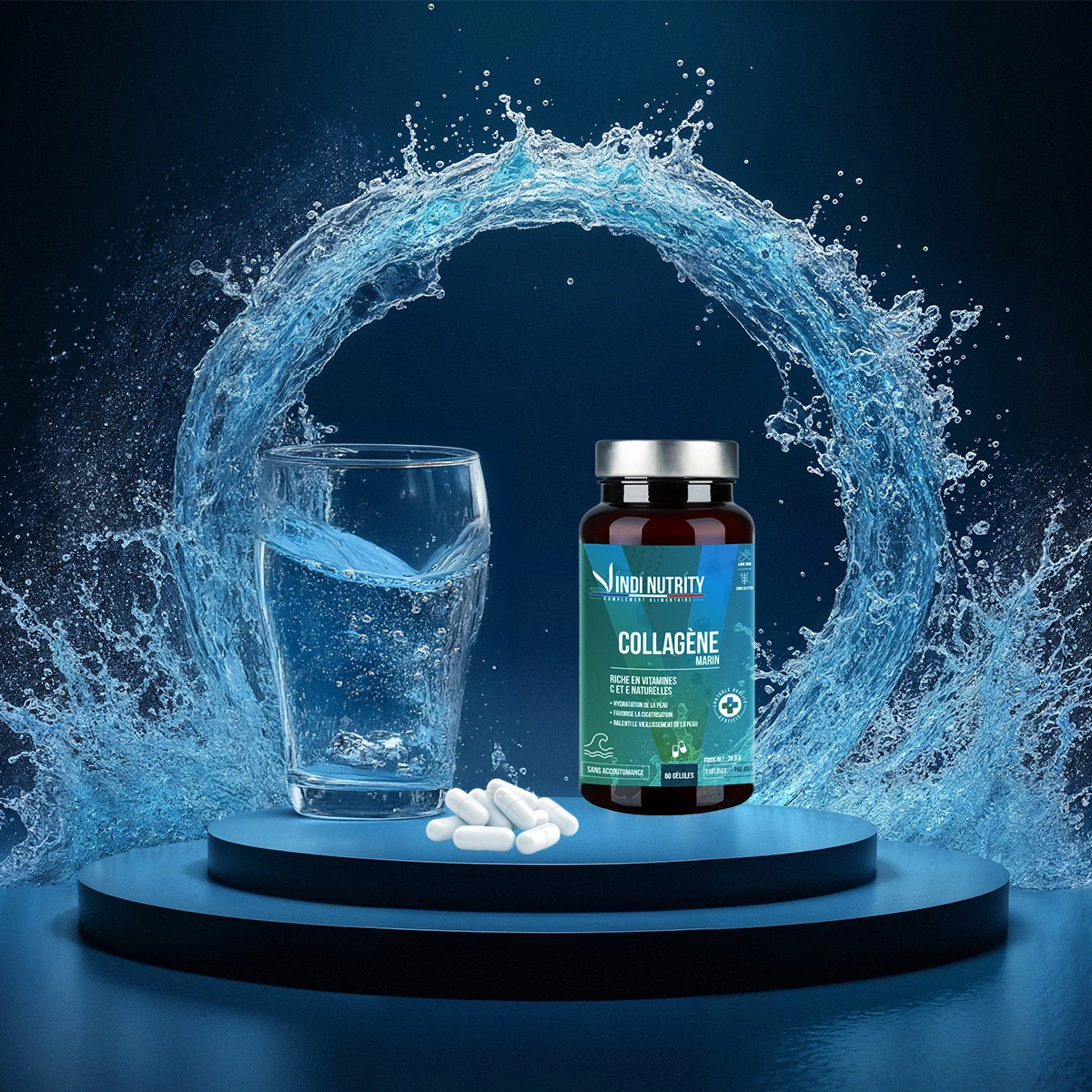 Collagène marin hydrolysé (Type 1 & 2) : soutient la structure de la peau, améliore son élasticité et favorise la cicatrisation.